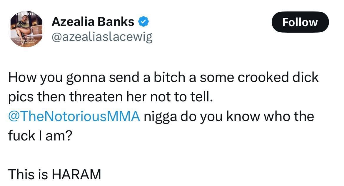 В июле 2025 года Азилия Бэнкс опубликовала в Twitter откровенные скриншоты с фотографиями и перепиской, якобы присланными Конором Макгрегором без её согласия. В материалах содержались интимные снимки и сообщения с угрозами, что она назвала сексуальным домогательством и несанкционированным сливом личных данных. Макгрегор не давал комментариев, однако инцидент вызвал значительный общественный резонанс.
